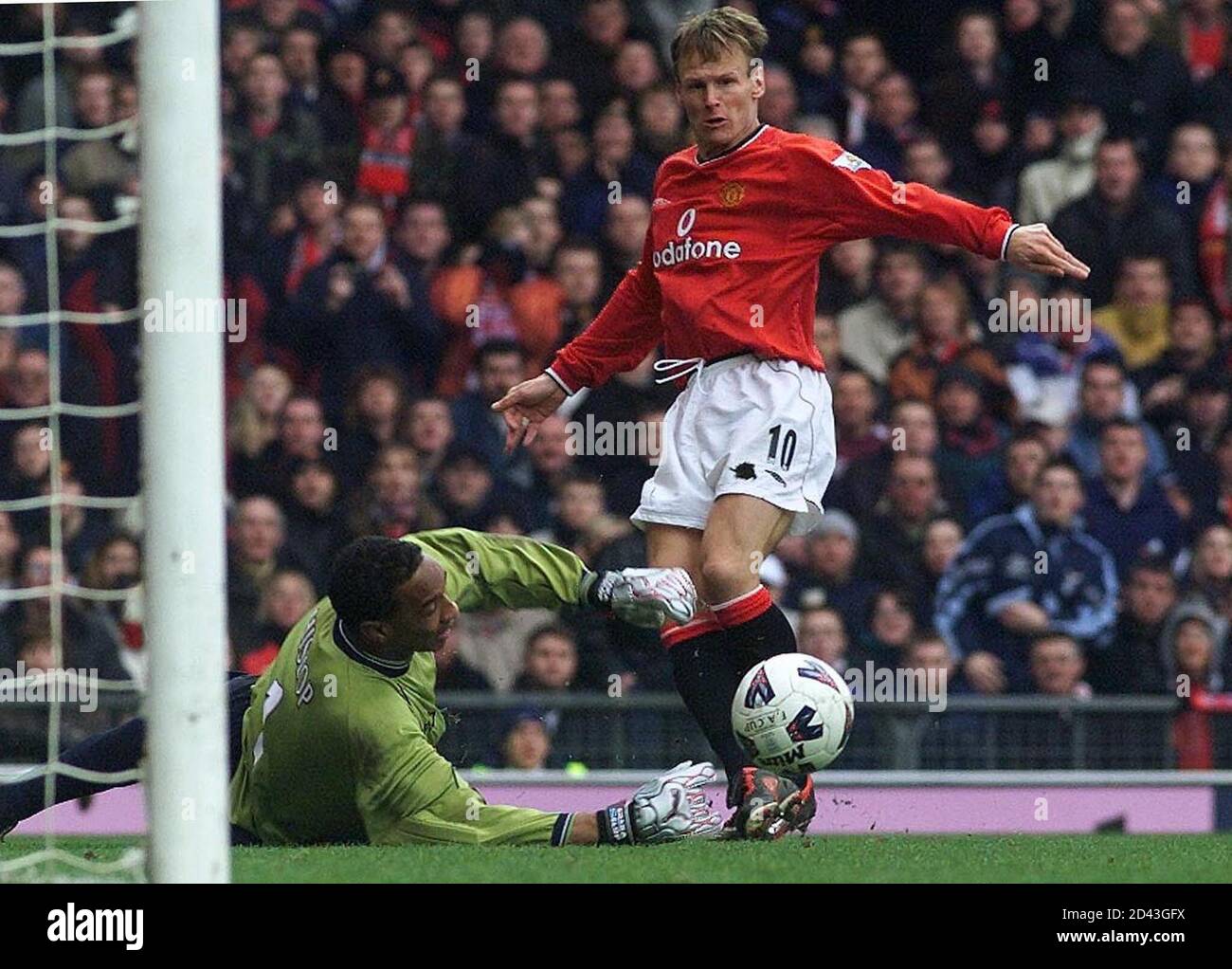 Manchester United S Teddy Sheringham Takes A Shot At The West Ham United Goal Which Is Saved By Shaka Hislop L In The Fa Cup Fourth Round At Old Trafford January 28 2001