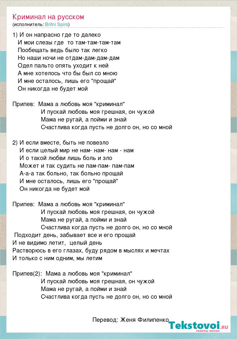 But Mama Im in love with a criminal And this type of love isnt rational Its physical Mama please dont cry I will be alright All reason aside I just cant deny Love the guy. перевод текста песни группы Britney Spears Бритни Спирс. Перевод текста песни Criminal исполнителя группы Britney Spears Бритни Спирс.